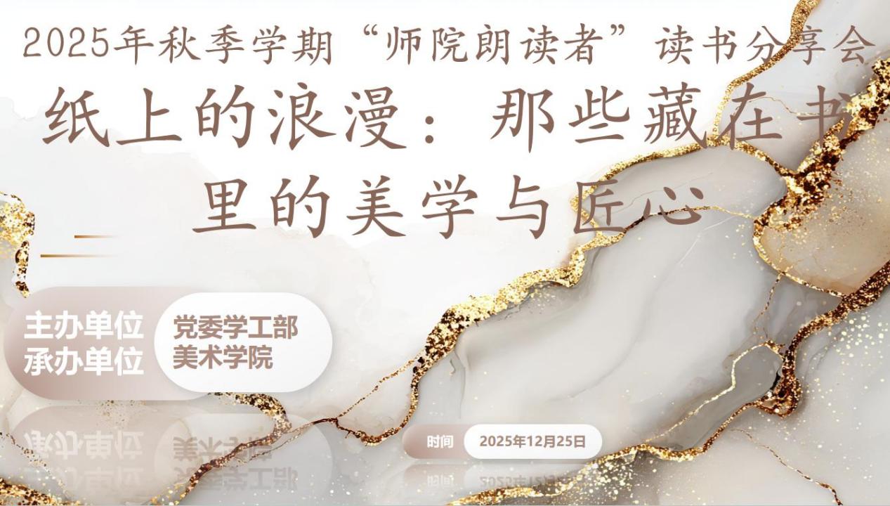 为进一步引导学生养成爱读书、读好书、善读书的良好习惯,2025年12月25日,由学工部主办、美术学院承办的第8期“师院朗读者”读书分享会在启真楼209会议室举行。本次活动以“纸上的浪漫:那些藏在书里的美学与匠心”为主题。党委学工部部长出席活动,来自幼儿教育学院、马克思主义学院、数学与统计学院和美术学院的辅导员和学生代表共同参加。