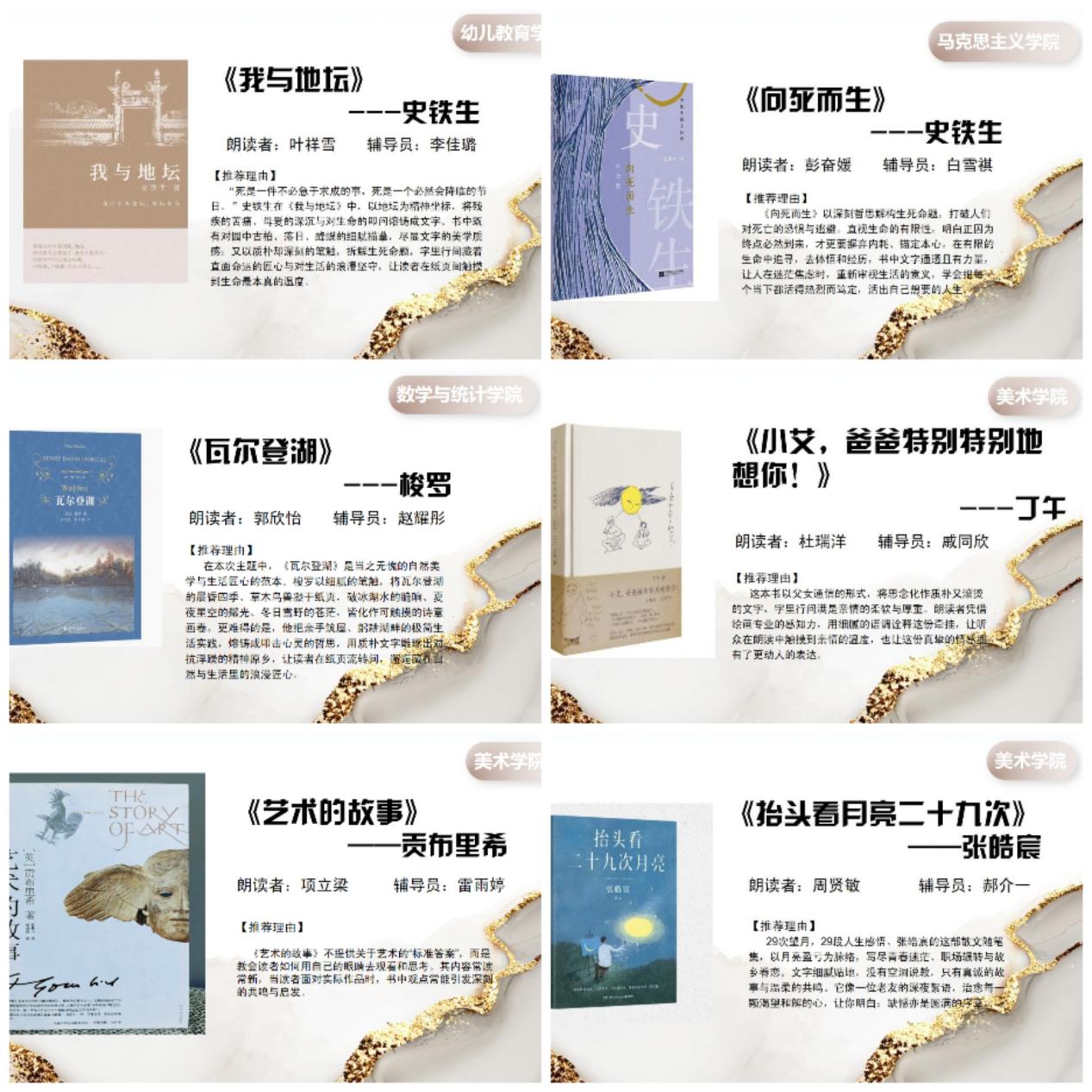 分享会上,六本精选书籍如同六颗星辰,照亮了“师院朗读者”的现场。大家跟随《我与地坛》《向死而生》体会生命的沉静,走进《瓦尔登湖》感受自然的清澈,又在《艺术的故事》中眺望文明的轮廓。其中,《小艾,爸爸特别特别地想你》中那些质朴真挚的信笺最是动人,轻声诵读的字句间,温情暖意在现场缓缓流淌。而《抬头看二十九次月亮》更让在场师生深刻领悟,阅读从不是脱离生活的空谈,而是在平凡日常里感受诗意与热爱。